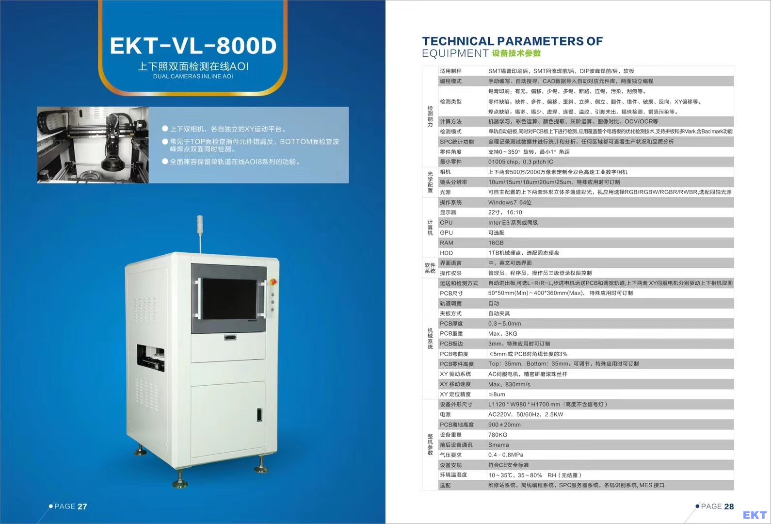 本公司自動光學檢測儀EKT-VL-800D是通過光學原理,綜合運用彩色運算,顏色提取,灰階運算,圖像對比等原理來檢查SMT生產線上貼裝原件的焊接質量、安裝狀態及錫膏印刷的效果,并將不良通過顯示終端輸出的專業產品。其特點是:上下雙相機,各自獨立的XY運動平臺,常見于TOP面檢查插件元件錯漏反,BOTTOM面檢查波峰焊點雙面同時檢測。上下照雙面檢在線AOI我們可以做成三種軌道:1.同步鏈輪式的AOI,適用于波峰焊后檢測。2.鏈條式的AOI,也可以適用于波峰焊后的工位檢測。3.皮帶式輸送帶,這個價格銷微優惠點,成本低一點,這個適用于回流焊后的工位檢測。客戶工廠根據自己的需求再評估選擇。