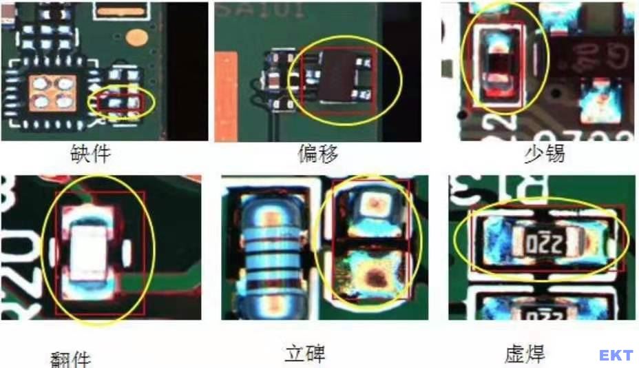 缺件、立碑、側(cè)立、極反、旋轉(zhuǎn)、位移、偏移、錯件(OCV)、損件、反件、多件、異物、錫多、錫少、橋接、DIP類元件吃錫、翹腳、金手指表面刮傷、粘錫 |